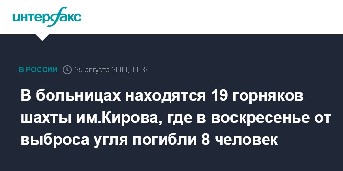 Москва. 25 августа. INTERFAX.RU - По состоянию на понедельник в лечебных учреждениях находятся 19 горняков шахты им.С.Кирова (госпредприятие "Макеевуголь", Донецкая обл), сообщает руководитель пресс-службы МинЧС Игорь Кроль.