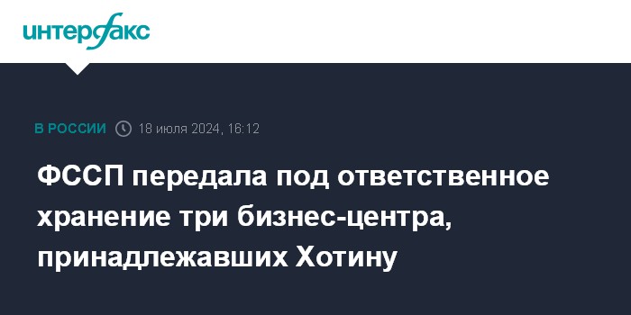 Москва. 18 июля. INTERFAX.RU - Федеральная служба судебных приставов передала под ответственное хранение три столичных бизнес-центра, принадлежащих бывшему владельцу банка "Югра" Алексею Хотину в рамках возмещения ущерба от неуплаты налогов.
