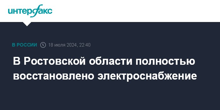 Москва. 18 июля. INTERFAX.RU - Временное отключение энергоснабжения отменено в Ростовской области, всем отключенным потребителям вернули свет, сообщает Минпромэнерго региона в телеграм-канале.