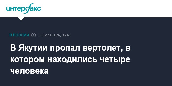 Москва. 19 июля. INTERFAX.RU - Вертолет Robinson R44II, на борту которого находились пилот и три пассажира, пропал в Якутии, сообщило Восточное межрегиональное следственное управление на транспорте СК России.