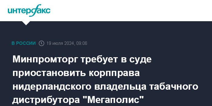 Минпромторг требует в суде приостановить корпправа нидерландского владельца табачного дистрибутора "Мегаполис"