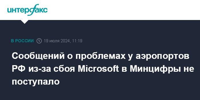 Москва. 19 июля. INTERFAX.RU - Сообщений о сбоях систем российских аэропортов, связанных с проблемами в работе программ компании Microsoft, в Минцифры не поступало, сообщили журналистам в пресс-службе министерства.
