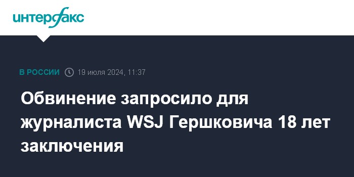 Москва. 19 июля. INTERFAX.RU - Обвинение на процессе в Свердловском областном суде запросило 18 лет лишения свободы для журналиста The Wall Street Journal Эвана Гершковича, обвиняемого в шпионаже.