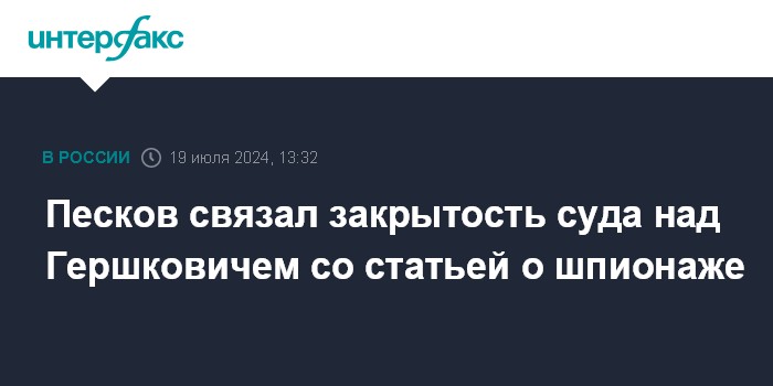 Москва. 19 июля. INTERFAX.RU - Суд над журналистом The Wall Street Journal Эваном Гершковичем проходит в закрытом режиме в связи со статьей, по которой его обвиняют, а также с чувствительностью уголовного дела, заявил пресс-секретарь президента Дмитрий Песков.
