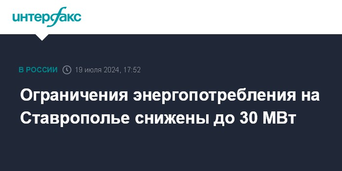 Москва. 19 июля. INTERFAX.RU - Ограничения энергопотребления в Ставропольском крае, введенные в пятницу днем из-за перегруза на транзитных линиях Волгоград-Ростов, были снижены с 55 МВт до 30 МВт, сообщает министерство энергетики, промышленности и связи края в своем телеграм-канале.