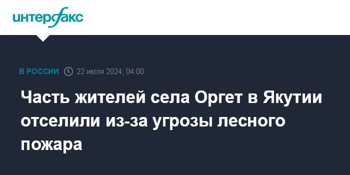 Москва. 22 июля. INTERFAX.RU - Организовано переселение части жителей села Оргет в Верхневилюйском районе, которому угрожает лесной пожар, написал в своем телеграм-канале глава района Валерий Николаев.