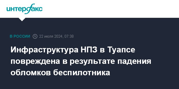 Москва. 22 июля. INTERFAX.RU - В результате падения обломков украинского беспилотника на НПЗ в Туапсе произошло возгорание, повреждена инфраструктура, сообщает оперштаб Краснодарского края.