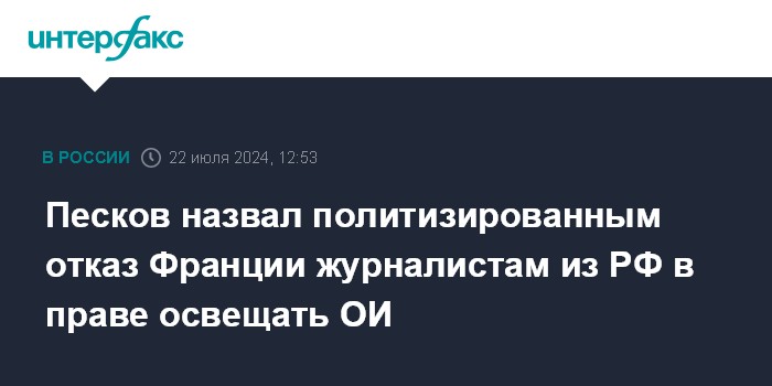Москва. 22 июля. INTERFAX.RU - Решение Франции отказать некоторым российским журналистам в праве освещать Олимпиаду политизировано и неприемлемо, оно напрямую ущемляет свободу СМИ, заявил пресс-секретарь президента РФ Дмитрий Песков.