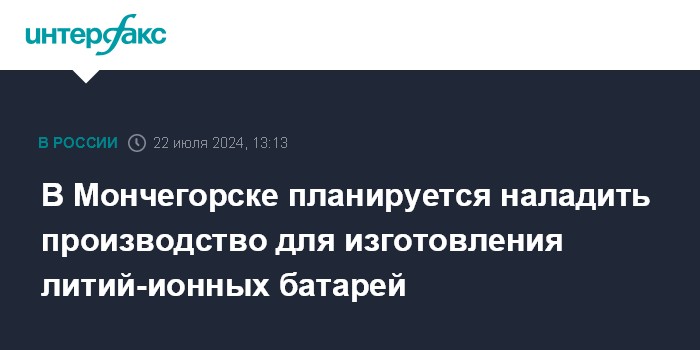 Москва. 22 июля. INTERFAX.RU - Производство для изготовления литий-ионных батарей планируется развернуть в Мончегорске, сообщил губернатор Мурманской области Андрей Чибис на оперативном совещании в правительстве региона в понедельник.