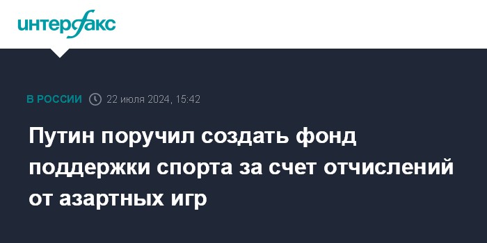 Москва. 22 июля. INTERFAX.RU - Президент Владимир Путин поручил правительству создать фонд по дополнительной поддержке спорта, который должен финансироваться в основном за счет отчислений от азартных игр.