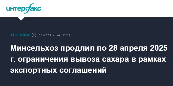 Минсельхоз продлил по 28 апреля 2025 г. ограничения вывоза сахара в рамках экспортных соглашений