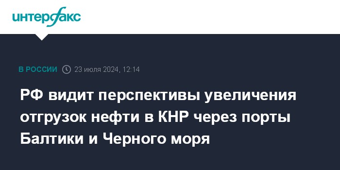 Москва. 23 июля. INTERFAX.RU - Россия видит перспективы увеличения отгрузок российской нефти в Китай через порты на Балтике и Черном море, сообщил заместитель министра энергетики РФ Сергей Мочальников в ходе заседания российско-китайской межправкомиссии по энергетике.