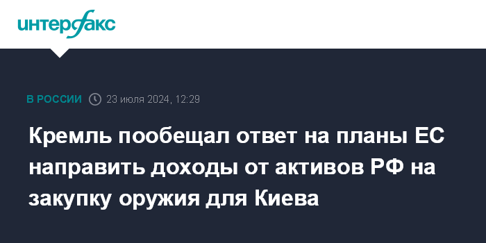 Москва. 23 июля. INTERFAX.RU - Россия не оставит без ответа планы Евросоюза направить доходы от замороженных российских активов на закупку оружия для Украины, заявил пресс-секретарь президента РФ Дмитрий Песков.