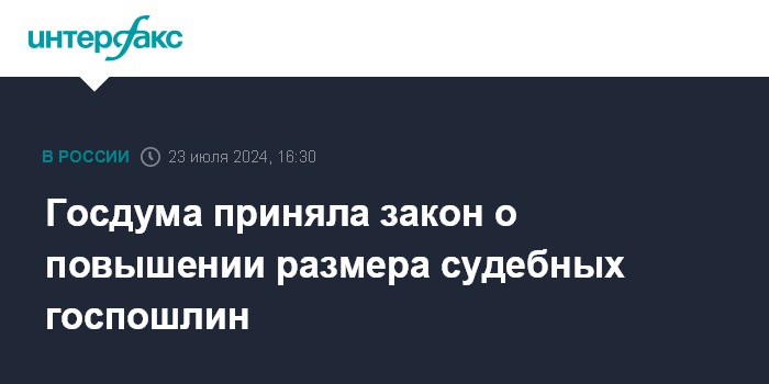 Москва. 23 июля. INTERFAX.RU - Госдума во втором и третьем чтениях приняла поправки в Налоговый кодекс, повышающие размер государственных пошлин при обращении в суды, а также увеличивающие их верхний предел с 200 тысяч рублей до 10 млн рублей в арбитражных судах и с 60 тысяч рублей до 900 тысяч рублей в судах общей юрисдикции.