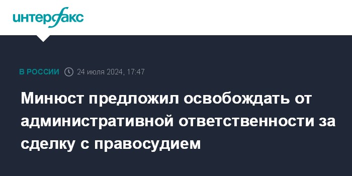 Москва. 24 июля. INTERFAX.RU - Министерство юстиции предлагает закрепить в законодательстве механизм сделки с правосудием, освобождающий от административной ответственности, сообщает сайт ведомства.
