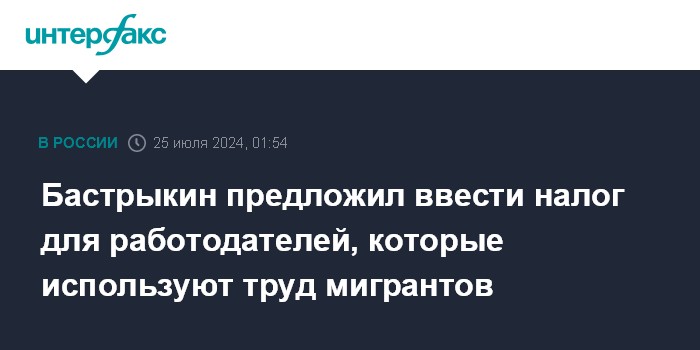 Москва. 25 июля. INTERFAX.RU - В СК РФ полагают, что необходимо экономически мотивировать использующих российские трудовые ресурсы предпринимателей и ввести налог на использование рабочей силы иностранных граждан, заявил в интервью "Российской газете" председатель комитета Александр Бастрыкин.