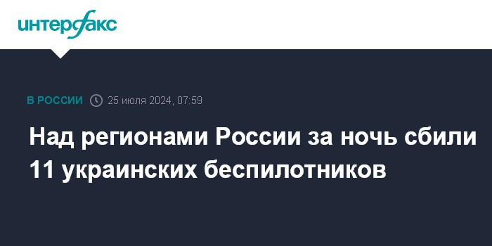 Москва. 25 июля. INTERFAX.RU - Российские военные заявили, что за прошедшую ночь средствами ПВО было перехвачено и уничтожено 11 украинских беспилотников.