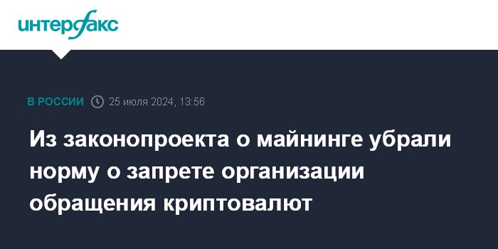 Москва. 25 июля. INTERFAX.RU - Комитет Госдумы по финансовому рынку убрал ко второму чтению законопроекта о майнинге цифровых валют норму о запрете на организацию ее обращения в России, при этом запрет на рекламу остался, сообщил в Telegram зампредседателя комитета Госдумы по информационной политике Антон Горелкин.