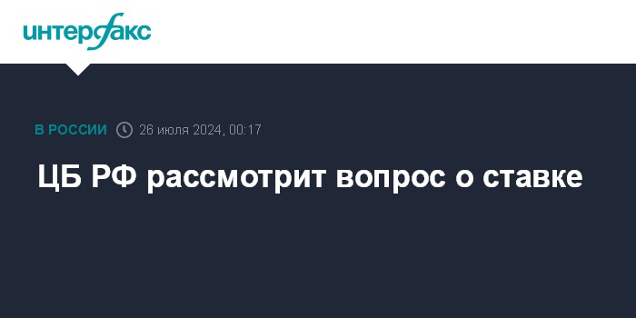 Москва. 26 июля. INTERFAX.RU - Совет директоров Банка России на заседании в пятницу рассмотрит вопрос об уровне ключевой ставки.