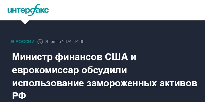 Москва. 26 июля. INTERFAX.RU - Министр финансов США Джанет Йеллен обсудила с еврокомиссаром по экономике Паоло Джентилони меры по реализации достигнутых в рамках G7 договоренностей по замороженным российским активам, сообщил американский Минфин.