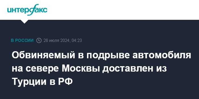"Федеральной службой безопасности Российской Федерации совместно с МВД России и при содействии спецслужб и правоохранительных органов Турецкой Республики задержан в городе Бодруме (Турция) и 26 июля 2024 года доставлен в Россию находящийся в международном розыске российский гражданин Серебряков Евгений Николаевич, 1995 г.р., причастный к совершению 24 июля 2024 года подрыва автомобиля на севере Москвы", - сообщили в ведомстве в ночь на пятницу.