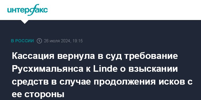 Кассация вернула в суд требование Русхимальянса к Linde о взыскании средств в случае продолжения исков с ее стороны