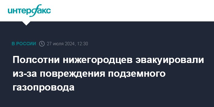 Москва. 27 июля. INTERFAX.RU - Несколько десятков жителей эвакуируют в центре Нижнего Новгорода из-за повреждения подземного газопровода, сообщает региональное ГУ МЧС РФ.