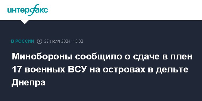 Москва. 27 июля. INTERFAX.RU - Российские военные заявили о добровольной сдаче в плен семнадцати украинских военных в Херсонской области.