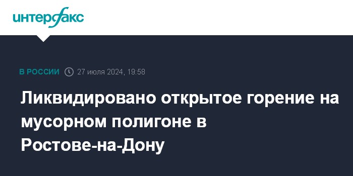 Москва. 27 июля. INTERFAX.RU - Пожарные ликвидировали открытое горение на полигоне бытовых отходов в Ростове-на-Дону, сообщила пресс-служба ГУ МЧС России по Ростовской области.