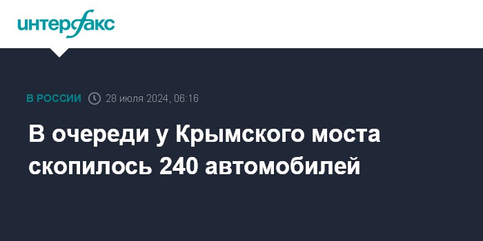 Москва. 28 июля. INTERFAX.RU - Проезда через досмотровые пункты на Крымском мосту в воскресенье утром ожидают 240 автомобилей, сообщает телеграм-канал, освещающий ситуацию на автомобильных подходах к мосту.