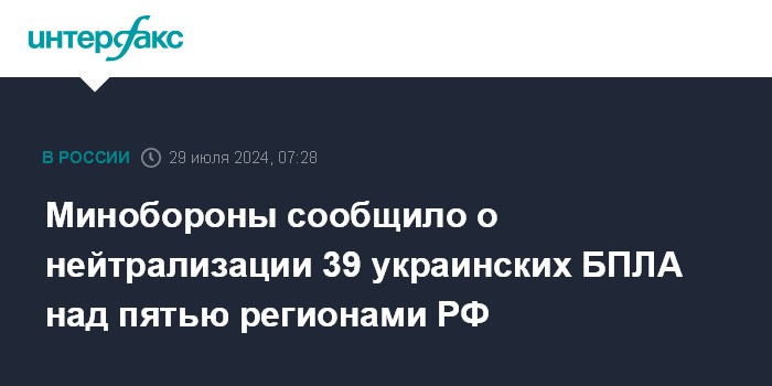 Москва. 29 июля. INTERFAX.RU - Силы противовоздушной обороны (ПВО) нейтрализовали за минувшую ночь 39 украинских беспилотников над пятью российскими регионами, сообщило Минобороны РФ в понедельник утром.