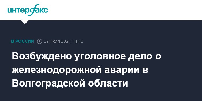 Москва. 29 июля. INTERFAX.RU - В связи со сходом с рельсов вагонов пассажирского поезда в Волгоградской области возбуждено уголовное дело о нарушении правил безопасности движения на железнодорожном транспорте (ст. 263 УК) . Об этом сообщил телеграм-канал западного межрегионального управления Следственного комитета на транспорте.