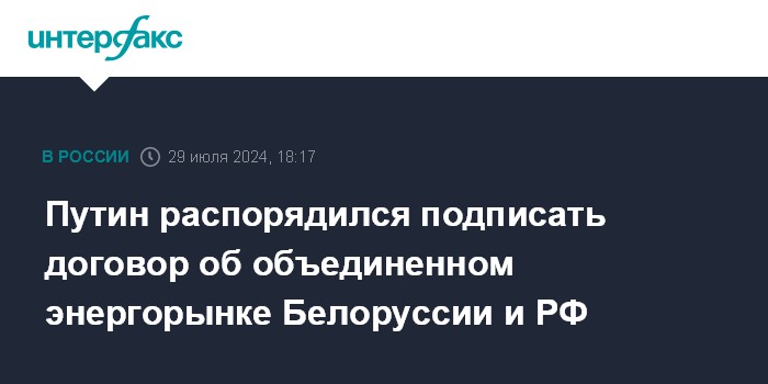 Москва. 29 июля. INTERFAX.RU - Президент России Владимир Путин распорядился подписать договор о создании единого энергетического рынка Союзного государства, соответствующий документ опубликован в понедельник на официальном портале правовых актов РФ.