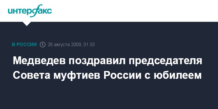 Москва. 26 августа. ИНТЕРФАКС - Президент России Дмитрий Медведев направил поздравительную телеграмму председателю Совета муфтиев России Равилю Гайнутдину с 50-летием, сообщила в среду пресс-служба президента РФ.