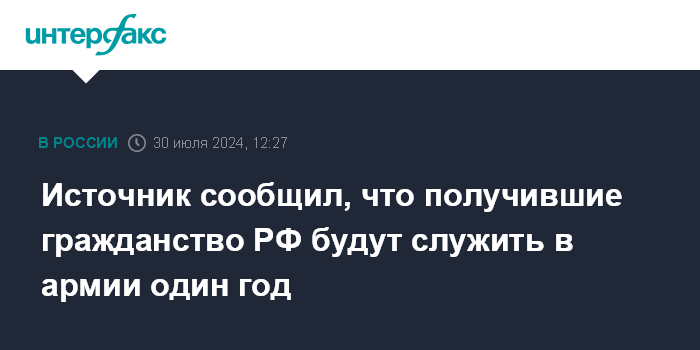Москва. 30 июля. INTERFAX.RU - Лицам, которые получают гражданство РФ, придется служить в армии по призыву один год, а не два, как предлагалось ранее, сообщил "Интерфаксу" информированный источник в нижней палате парламента.