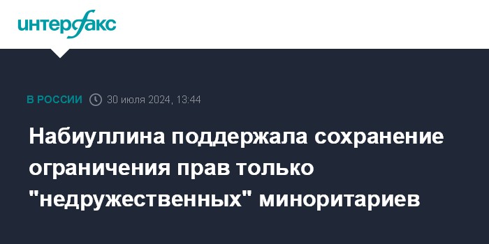 Москва. 30 июля. INTERFAX.RU - Ограничения на доступ к информации о деятельности компаний и судебной защите прав акционеров должны сохраняться не для всех миноритариев, а только для представителей "недружественных" стран, считает председатель Банка России Эльвира Набиуллина. Она высказала такое мнение, выступая в Совете Федерации.