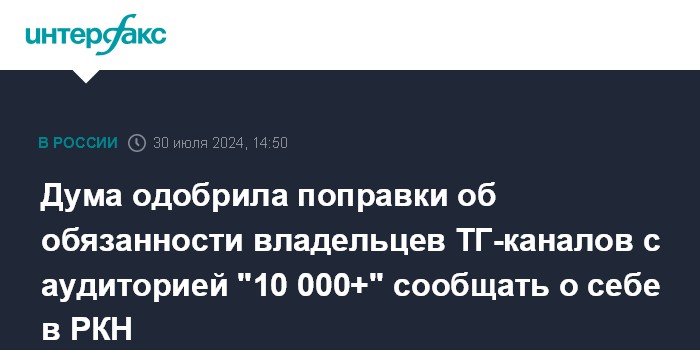 Дума одобрила поправки об обязанности владельцев ТГ-каналов с аудиторией "10 000+" сообщать о себе в РКН