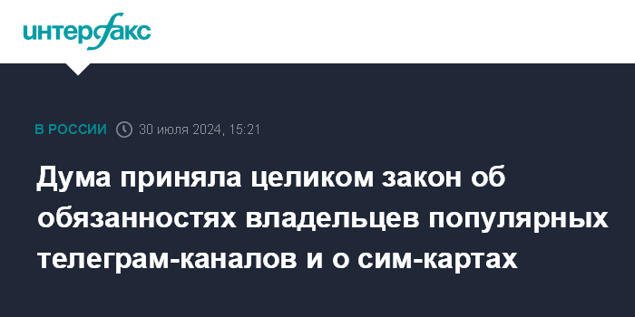 Москва. 30 июля. INTERFAX.RU - Госдума приняла во втором и третьем чтениях пакет поправок, которые регулируют работу в сервисах обмена мгновенными сообщениями владельцев популярных каналов, у которых более 10 тысяч подписчиков, а также о правилах оказания услуг связи и выдачи сим-карт.
