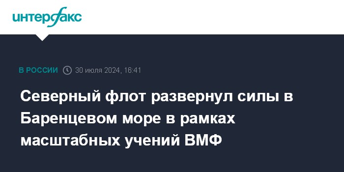 Москва. 30 июля. INTERFAX.RU - В рамках масштабных учений ВМФ России Северный флот развернул свои силы в Баренцевом море, сообщила пресс-служба флота во вторник.