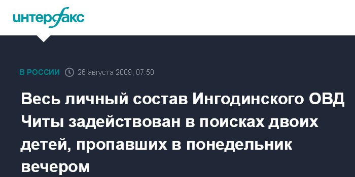 Чита. 26 августа. ИНТЕРФАКС-СИБИРЬ - В поисках двух детей, пропавших в понедельник вечером в поселке Песчанка (пригород Читы) задействован почти весь личный состав Ингодинского ОВД города Читы, - сообщили агентству "Интерфакс-Сибирь" в районном отделении милиции.