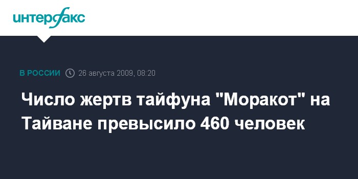 Москва. 26 августа. INTERFAX.RU - На Тайване установлена гибель в результате удара тайфуна "Моракот" 461 человека, число пропавших без вести составляет 192 человека, ранения и травмы получили 46 человек, сообщили китайские СМИ со ссылкой на заявление тайваньского центра катастроф.