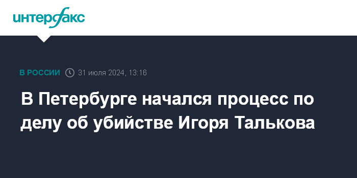 Москва. 31 июля. INTERFAX.RU - Петроградский районный суд начал рассматривать дело убийстве в 1991 году певца Игоря Талькова, передал корреспондент "Интерфакса". В убийстве и в покушении на представителя певицы Азизы Игоря Малахова обвиняется директор Талькова Валерий Шляфман. Его судят заочно, по данным следствия, он находится в Израиле.