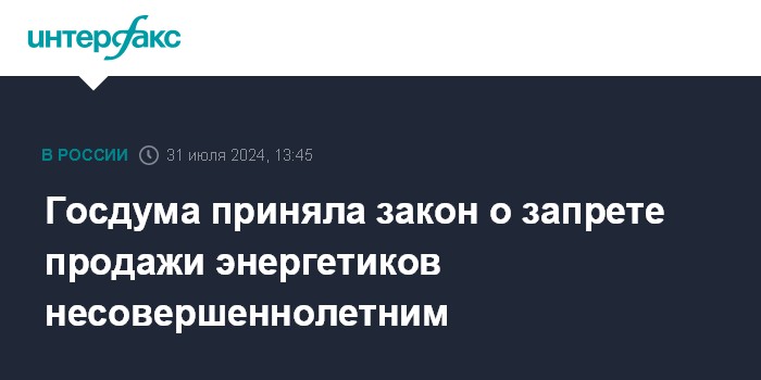 Законом вводится запрет розничной продажи энергетических напитков несовершеннолетним на территории всей страны, кроме того, "регионам даются дополнительные полномочия, чтобы они могли навести порядок в этой сфере, - речь идет о возможности ограничивать место и время продажи", написал в своем телеграм-канале председатель нижней палаты парламента Вячеслав Володин.