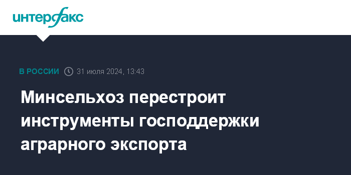 Москва. 31 июля. INTERFAX.RU - Минсельхоз в рамках работы над продлением проекта "Экспорт продукции АПК" (входит в федеральный проект "Международная кооперация и экспорт") основывается на перестройке инструментов господдержки аграрного экспорта с учетом имеющихся бюджетных ресурсов.