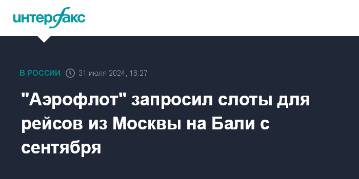 Москва. 31 июля. INTERFAX.RU - "Аэрофлот" запросил необходимые слоты для выполнения рейсов из Москвы в Денпасар (остров Бали, Индонезия), начиная с сентября этого года, сообщается в телеграм-канале перевозчика.