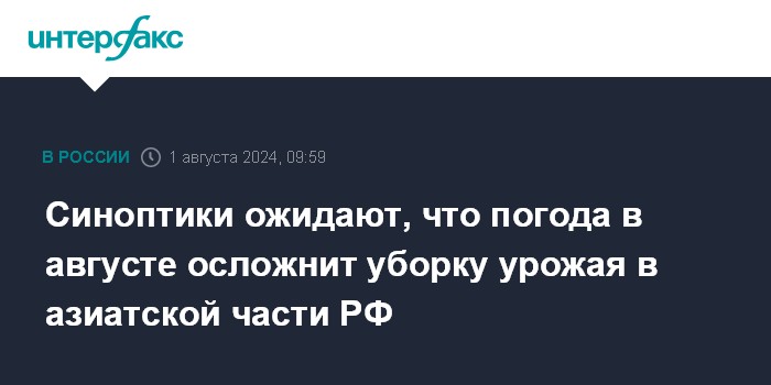 Синоптики ожидают, что погода в августе осложнит уборку урожая в азиатской части РФ