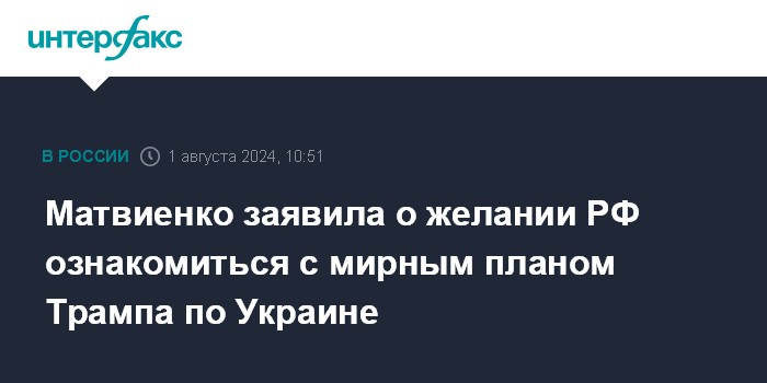 Москва. 1 августа. INTERFAX.RU - Россия не знает, в чем состоит мирный план экс-президента США Дональда Трампа по Украине, но хотела бы его получить, заявила спикер Совета Федерации Валентина Матвиенко.