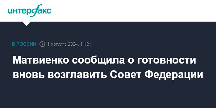 Москва. 1 августа. INTERFAX.RU - Спикер Совета Федерации Валентина Матвиенко готова вновь возглавить верхнюю палату парламента после региональных выборов в сентябре, если ее делегируют в качестве сенатора и выдвинут на этот пост.
