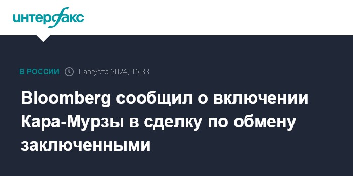 Москва. 1 августа. INTERFAX.RU - Российская сторона освободит оппозиционера и журналиста Владимира Кара-Мурзу (признан в России иноагентом), осужденного в России за госизмену, сообщает Bloomberg со ссылкой на источники. Кара-Мурзу включили в сделку по обмену заключенными.