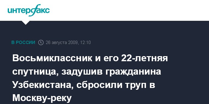 Москва. 26 августа. INTERFAX.RU - На северо-западе Москвы задержаны восьмиклассник и 22-летняя неработающая москвичка, которые ремнем от сумки задушили гражданина Узбекистана и бросили его тело в Москву-реку, сообщил "Интерфаксу" источник в правоохранительных органах города в среду.